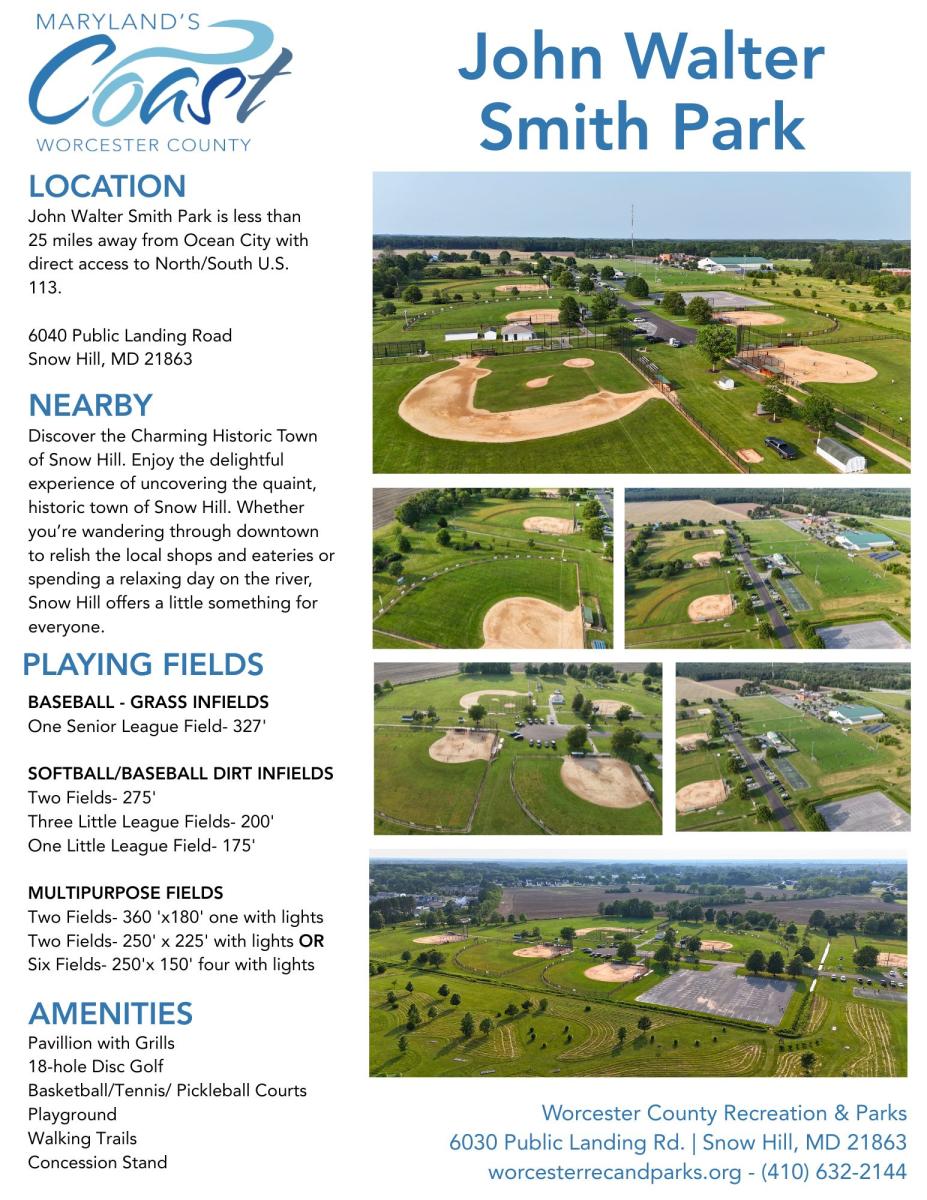John Walter Smith Park, located on Public Landing Road in Snow Hill, serves as the athletic complex to citizens in the central section of the County.  This location is where Worcester County Department of Recreation & Parks programming and maintenance operations are administered.