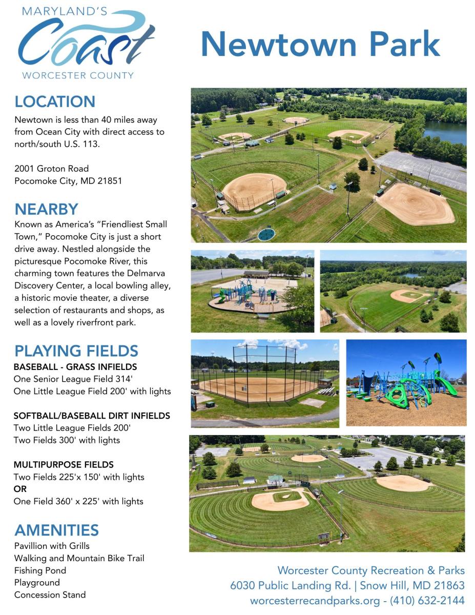 Newtown Park is located at the intersection of Stockton and Groton Roads in Pocomoke, serving as an athletic complex to citizens in the southern end of the County.