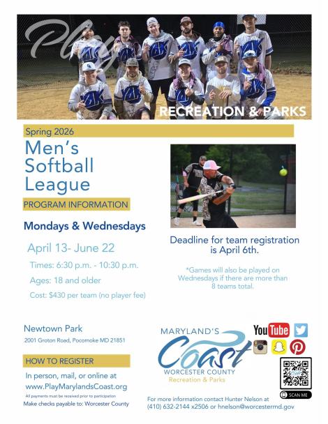 Men's Softball League Spring 2026 Upcoming Program Dates/Times: 04/13/2026 - 6:30pm04/15/2026 - 6:30pm04/20/2026 - 6:30pmRegister Here