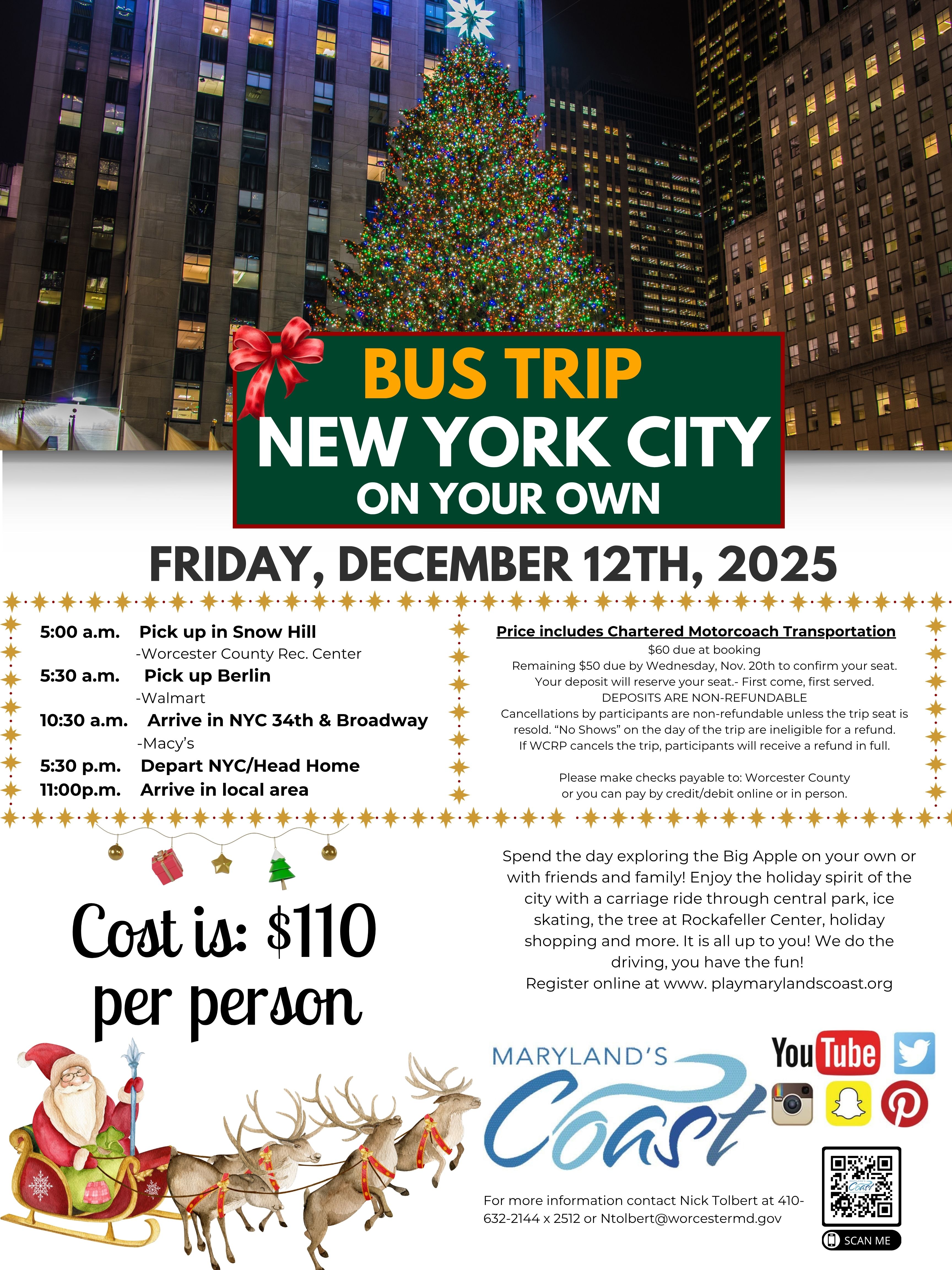 Spend the day exploring the big apple on your own during the most wonderful time of the year! Cost is $110 per person